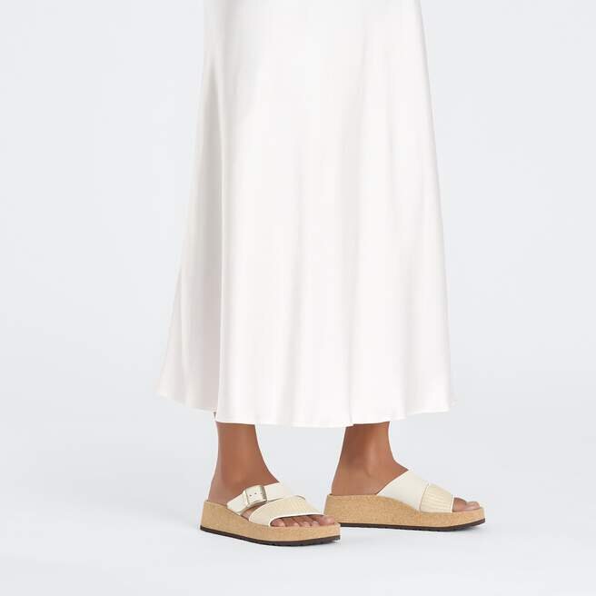 Une nouvelle sandale à talon compensé de Papillio by Birkenstock®. Les larges lanières en cuir de l’Almina offrent une stabilité accrue tout en laissant le raphia estival s’exprimer pleinement. Aussi élancée qu’elle en a l’air, elle est dotée d’une semelle intérieure profilée pour un soutien optimal. Faites passer votre confort avant tout.