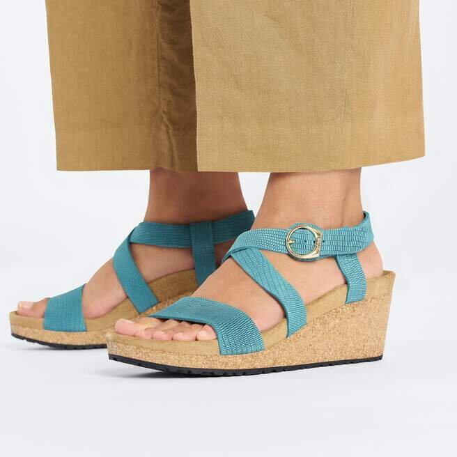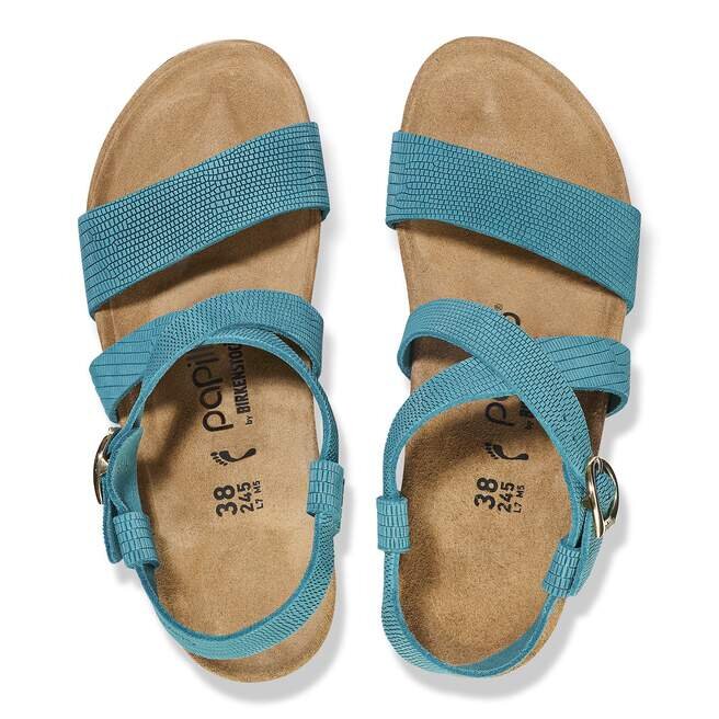 Nouveauté de Papillio® by Birkenstock®. La Sibyl Wedge passe au niveau supérieur en matière de confort et de facilité, surfant sur une vague de couleurs inspirées de la mer et du ciel. Des lanières en cuir gaufré s’entrecroisent confortablement sur le pied, réunies par une élégante boucle arrondie. Surélevée par une semelle compensée classique en liège, conçue autour de la semelle intérieure profilée que vous adorez.