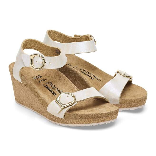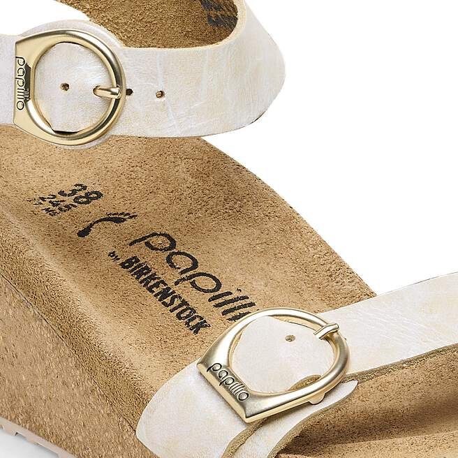 De la collection Papillio® by Birkenstock®. La Soley Wedge se distingue par son confort et sa simplicité, attirant tous les regards sur son passage. Des lanières en cuir métallisé s’entrecroisent sur le pied, maintenues par des boucles arrondies et brillantes. Surélevée par une semelle compensée classique en liège, conçue autour de la semelle intérieure profilée que vous adorez.