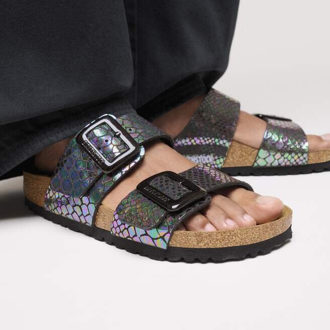 La Birkenstock Sydney prouve que mode et fonctionnalité peuvent aller de pair. Avec ses deux lanières simples, elle remporte un franc succès auprès des femmes qui recherchent à la fois la haute couture et le confort. Cette version se décline dans un motif serpent brillant et respire l’élégance et une touche d’extravagance grâce à la feuille métallique irisée et à l’aspect peau de serpent. Inspirées par la nature, aucune paire de chaussures n’a exactement le même aspect ni le même toucher. Les boucles rembourrées, brillantes et légèrement arrondies, attirent particulièrement l’œil. La tige est fabriquée dans un matériau synthétique respectueux de la peau.