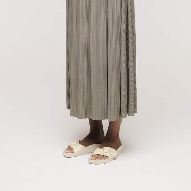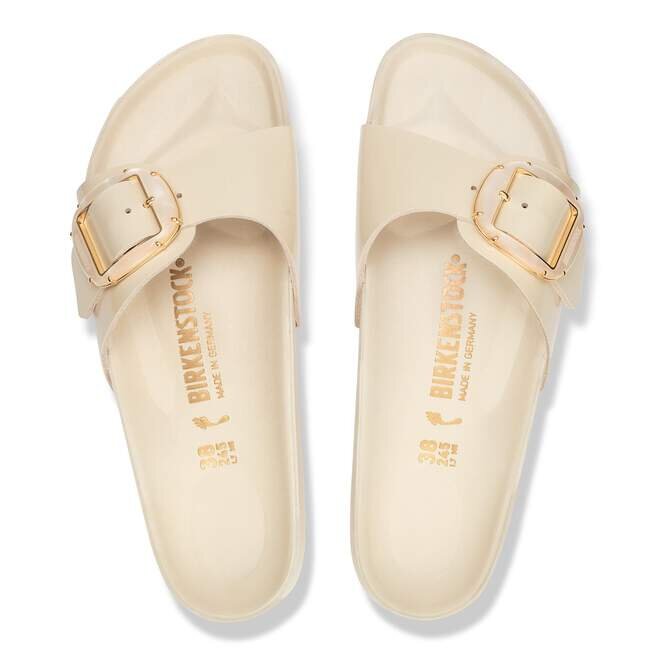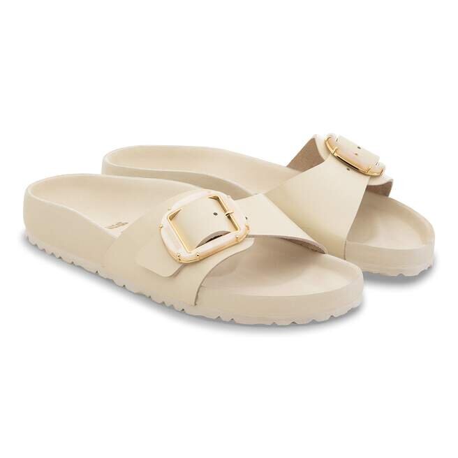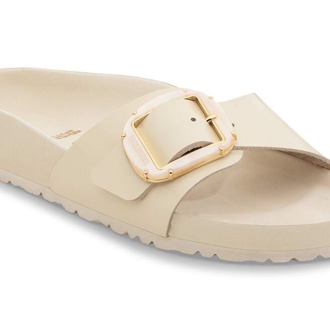 La Birkenstock Madrid est un véritable classique qui séduit le monde de la mode grâce à son design minimaliste. La Big Buckle nacrée apporte une touche féminine et confère un look luxueux. Avec son design brillant et ses délicats détails en perles métalliques, elle crée un look élégant et attire tous les regards. Les détails aux couleurs assorties viennent parfaire le look sophistiqué de cette chaussure. La semelle intérieure raffinée est entièrement doublée de cuir Piumato souple, ce qui la rend exceptionnellement confortable. La tige est fabriquée en cuir naturel de haute qualité avec un revêtement verni brillant.