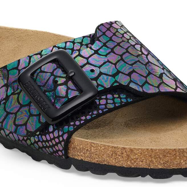 Le design de la Birkenstock Catalina s’inspire de la classique Madrid avec une bride et une boucle métallique. La bride légèrement plus large confère à cette sandale une allure moderne et élégante. Cette version se décline dans un motif serpent brillant et respire l’élégance et une touche d’extravagance grâce à la feuille métallique irisée et à l’aspect peau de serpent. Inspirées par la nature, aucune paire de chaussures n’a exactement le même aspect ni le même toucher. Les boucles rembourrées, brillantes et légèrement arrondies, attirent particulièrement le regard. La tige est fabriquée dans une matière synthétique douce pour la peau.