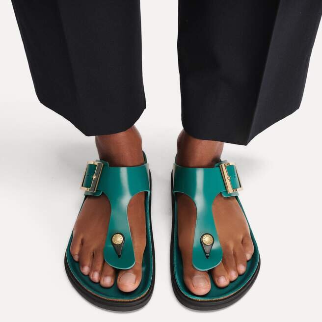 - Détails : Tong avec boucle métallique à broche réglable individuellement