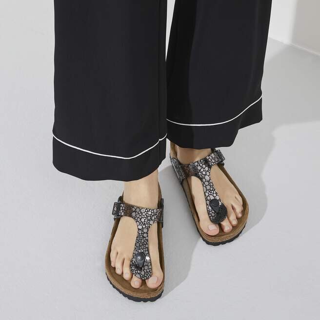 La Gizeh : une tong moderne signée Birkenstock. La Gizeh est un grand classique qui offre un maintien caractéristique et un style raffiné et minimaliste. Issu de notre collection Metallic Stones, ce modèle en édition limitée se distingue par une tige en microfibre souple rehaussée d’un superbe revêtement métallisé à motif galets. Le contraste entre les finitions mates et brillantes confère au matériau une profondeur de tons sophistiquée.