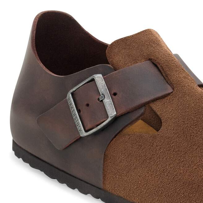 La Birkenstock London est une variante de la Boston classique. La partie talon surélevée est caractéristique de cette chaussure basse simple sans coutures. Elle présente un aspect naturel et rustique ainsi qu’une finition à bords francs et sans doublure. La tige est en daim associé à du cuir nubuck huilé.
